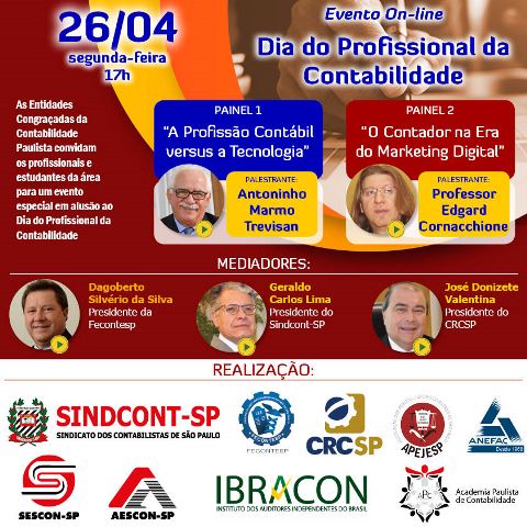 A Academia Paulista de Contabilidade - APC juntamente com as demais Entidades Congraçadas da Contabilidade do Estado de São Paulo celebrarão o Dia do Profissional da Contabilidade, 25 de abril, com uma série de atividades e palestras que têm a finalidade de debater o futuro da profissão, analisando as novas temáticas e perspectivas diante do cenário pandêmico da Covid-19, assim como a utilização do marketing digital em larga e crescente escala na profissão. A cerimônia festiva acontecerá nesta segunda-feira, dia 26 de abril, às 17h, de forma virtual, no https://bit.ly/3sIgjD4.